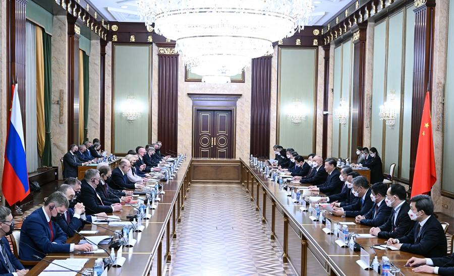 當地時(shí)間3月21日上午,國家主席習近平在俄羅斯聯(lián)邦政府大廈會(huì )見(jiàn)俄羅斯總理米舒斯京。新華社記者 張領(lǐng) 攝
