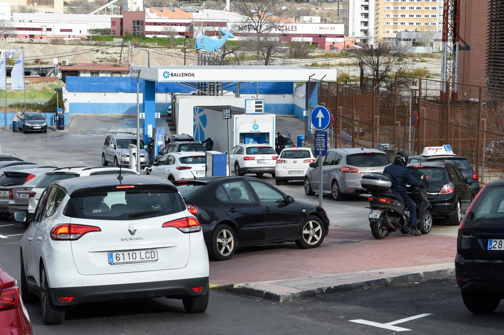 2022年12月31日,在西班牙馬德里,汽車(chē)排隊駛入一處加油站加油。(新華社發(fā),古斯塔沃·巴連特攝)