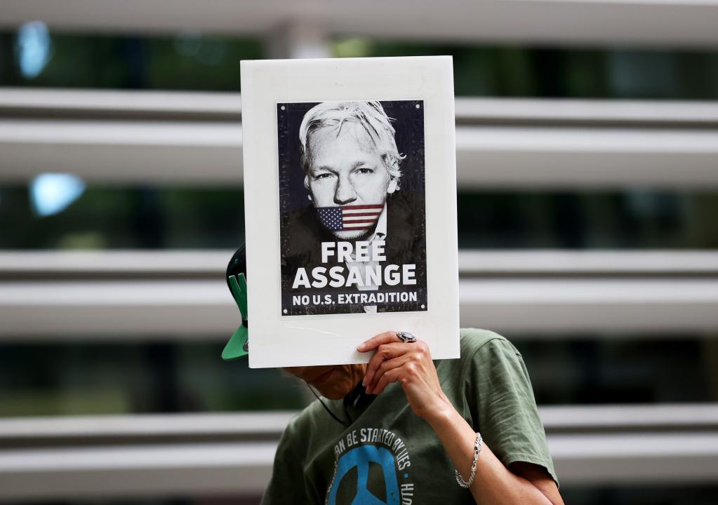 2022年5月17日,一名示威者在倫敦英國內政部大樓門(mén)前手舉“釋放阿桑奇”標語(yǔ)。新華社記者李穎攝