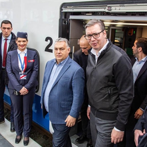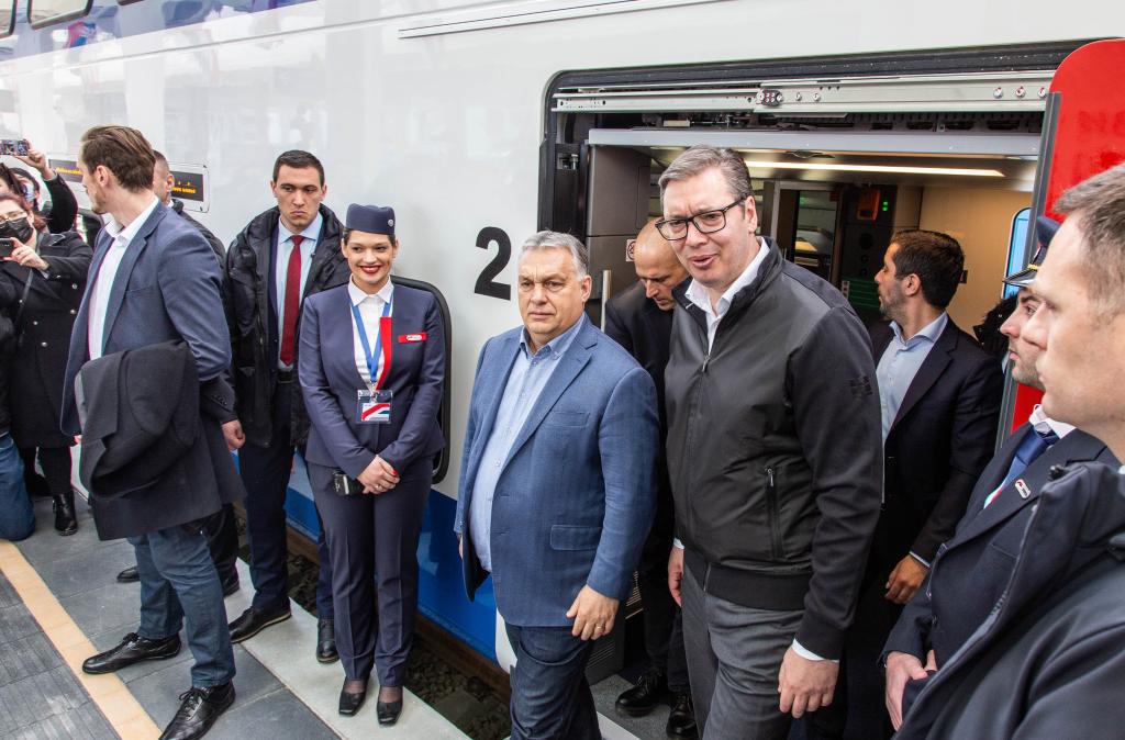 2022年3月19日,匈塞鐵路塞爾維亞境內貝諾段開(kāi)通運營(yíng)。塞爾維亞總統武契奇(中右)和匈牙利總理歐爾班(中左)乘坐列車(chē)抵達諾維薩德火車(chē)站。新華社發(fā)(王韡攝)