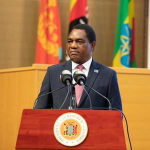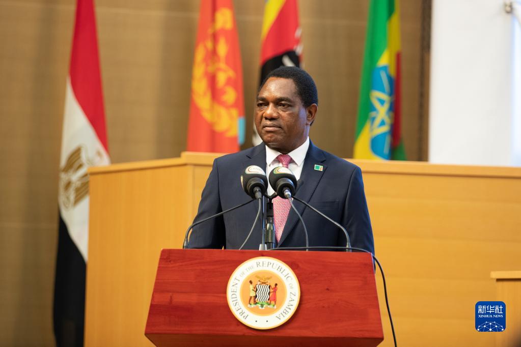 6月8日,在贊比亞首都盧薩卡,贊比亞總統希奇萊馬在第22屆東南非共同市場(chǎng)成員國領(lǐng)導人峰會(huì )上致辭。