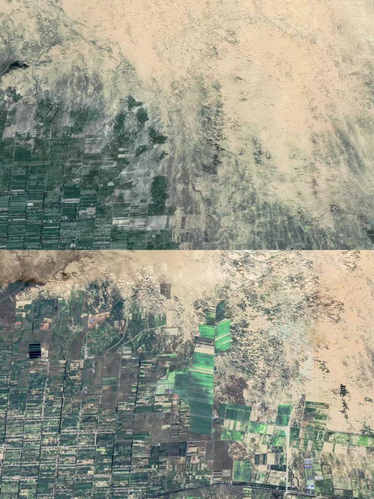 2005年9月(上圖)和2019年7月新疆策勒東北部的對比圖。
