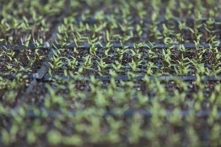 3月1日在新疆和田縣塔瓦庫勒鄉辣椒產(chǎn)業(yè)園育苗大棚拍攝的辣椒苗。當地位于塔克拉瑪干沙漠腹地,干旱少雨、土地高鹽堿化。新華社記者 郝昭 攝