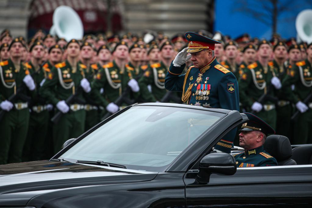 2021年5月9日,在俄羅斯莫斯科舉行的勝利日閱兵式上,俄國防部長(cháng)紹伊古檢閱部隊。新華社發(fā)(葉甫蓋尼·西尼岑攝)
