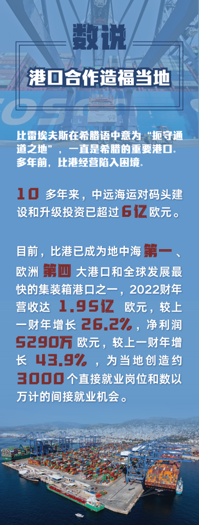 比雷埃夫斯在希臘語(yǔ)中意為“扼守通道之地”,一直是希臘的重要港口。多年前,比港經(jīng)營(yíng)陷入困境。中國遠洋海運集團(中遠海運)2008年與希臘方面簽署特許經(jīng)營(yíng)權協(xié)議,2010年接管比港二號、三號集裝箱碼頭,2016年收購比港港務(wù)局67%股權并接手港務(wù)局經(jīng)營(yíng)。十多年來(lái),中遠海運對碼頭建設和升級投資已超過(guò)6億歐元。如今比港已成為地中海第一、歐洲第四大港口和全球發(fā)展最快的集裝箱港口之一,2022財年營(yíng)收達1.95億歐元,較上一財年增長(cháng)26.2%,凈利潤5290萬(wàn)歐元,較上一財年增長(cháng)43.9%,為當地創(chuàng )造約3000個(gè)直接就業(yè)崗位和數以萬(wàn)計的間接就業(yè)機會(huì )。