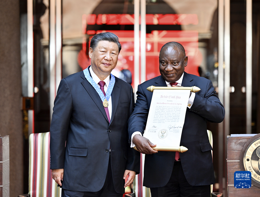 會(huì )談后,拉馬福薩向習近平授予“南非勛章”,這是南非授予重要友好國家元首的最高級別勛章和最高榮譽(yù)。