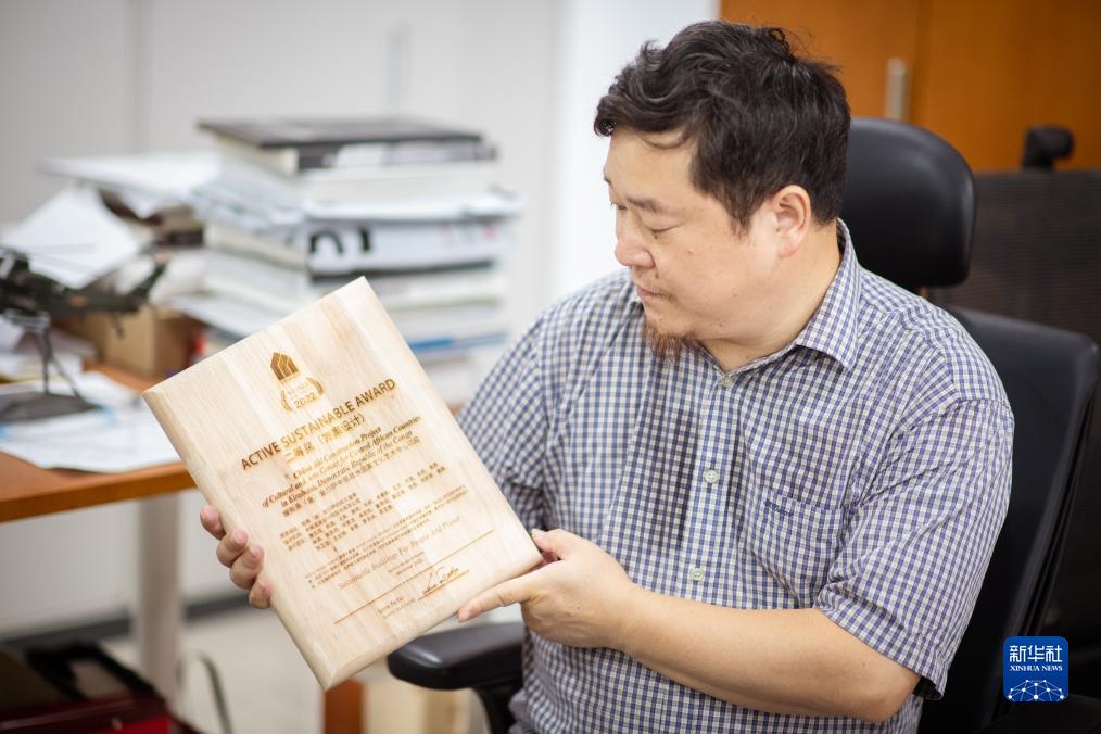 9月12日,在武漢中南建筑設計院總部,唐文勝展示中部非洲文化藝術(shù)中心設計方案獲獎獎牌。新華社記者 伍志尊 攝