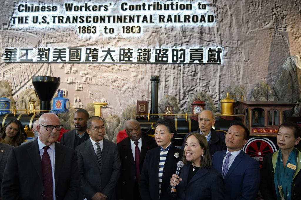 2023年5月10日,美國加利福尼亞州副州長(cháng)埃萊妮·庫納拉基斯(右三)在舊金山舉行的“鐵路華工歷史中心”揭幕儀式上講話(huà)。新華社記者 吳曉凌 攝