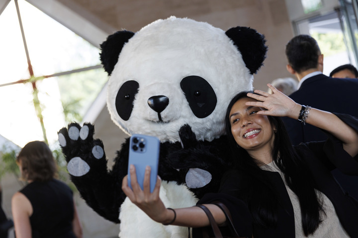 2022年8月24日,在美國華盛頓中國駐美國大使館,來(lái)賓與大熊貓玩偶合影。