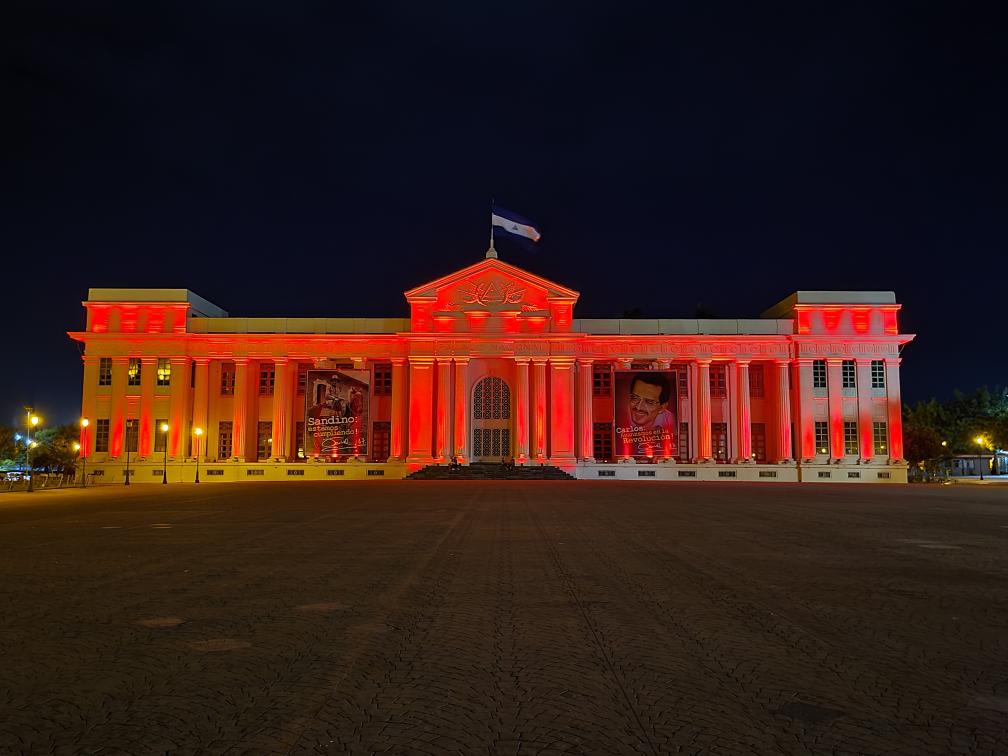 2022年1月31日,尼加拉瓜首都馬那瓜市中心標志性建筑國家宮點(diǎn)亮“中國紅”。新華社發(fā)(中國駐尼加拉瓜使館供圖)