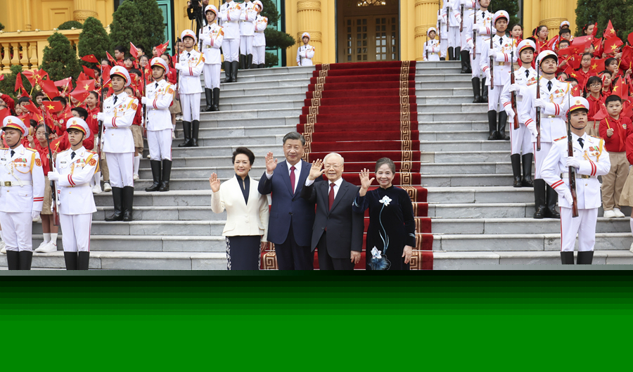 當地時(shí)間12月12日下午,剛剛抵達河內的中共中央總書(shū)記、國家主席習近平在越共中央駐地同越共中央總書(shū)記阮富仲舉行會(huì )談。這是阮富仲在主席府廣場(chǎng)為習近平舉行隆重歡迎儀式。