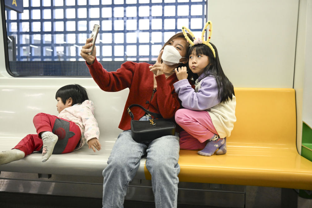 2023年12月9日,市民在越南河內吉靈-河東線(xiàn)輕軌車(chē)廂里自拍。新華社記者程一恒攝